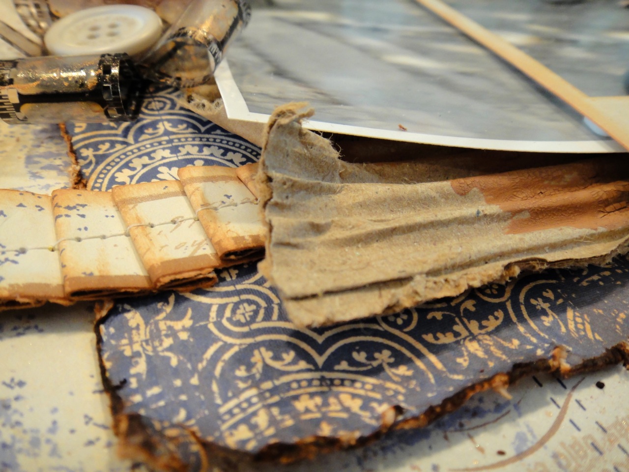 I pleated my leftover strips and inked them, then ran them through the sewing machine and added them to the mat under my photo along with some corrugated cardboard that I distressed and painted here and there with the Vintage Photo Distress Crackle Paint included in the main kit.